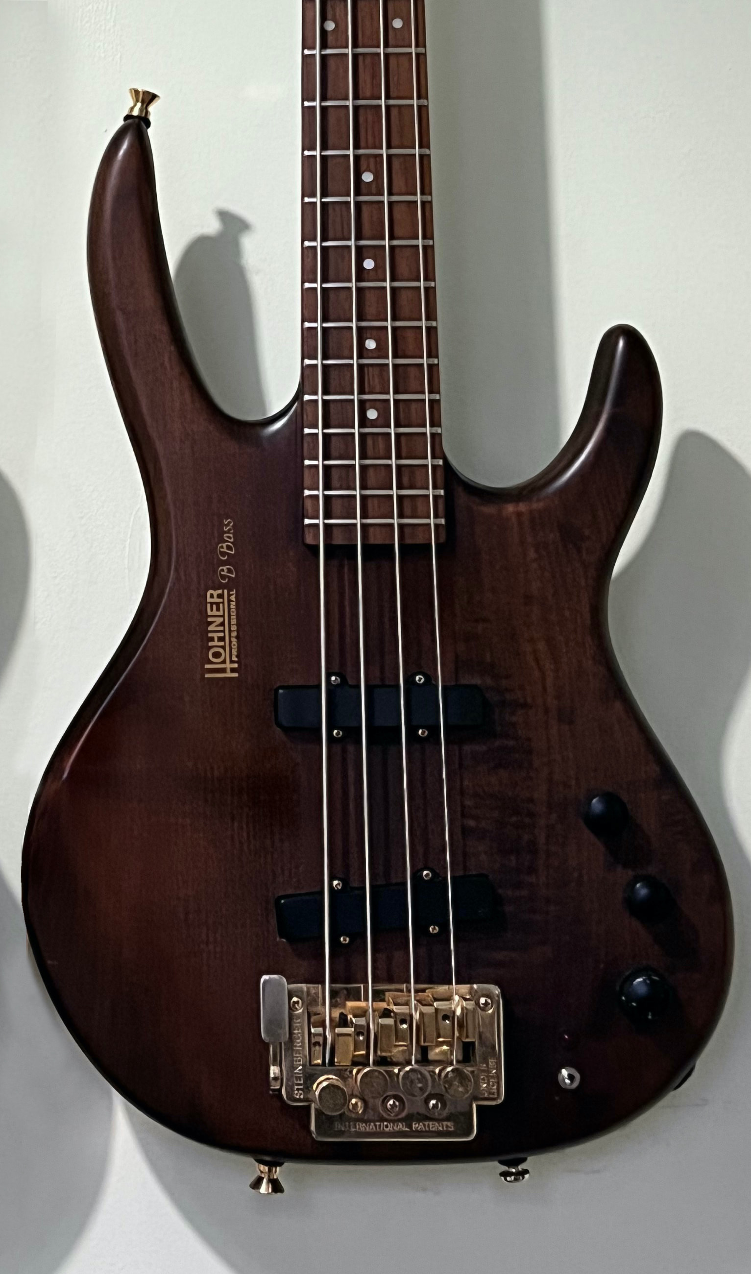 I have a gorgeous B Bass in walnut with gold hardware, I am not really sold on the gold, it look a bit tatty. Also the threads have gone on the tuner knob so the detuner isn’t really doing its job.