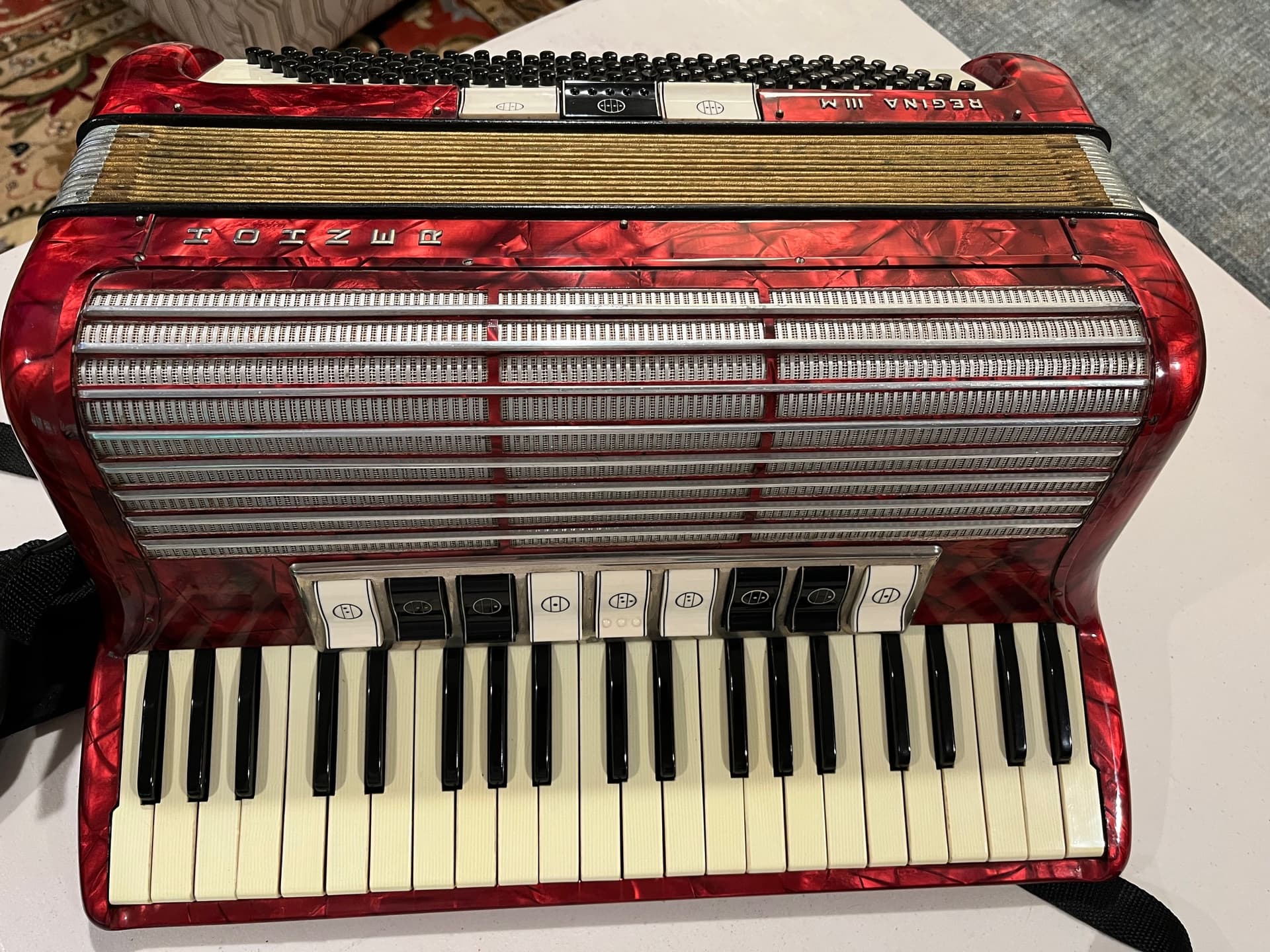 I checked back with Accordion Service. They say that in the 1950s the Regina III M was sold as a “Ladies Model”. Despite the range of 41 treble keys and 120 bass buttons, the construction is smaller than many comparable models and the keys are narrower, hence the designation. It was not made in large numbers.