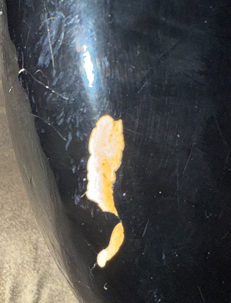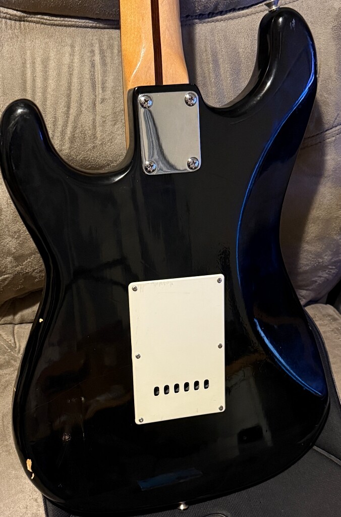 Several white (paint) marks on back of body came off with a bit of moisture and a bandana. A few dings in the black finish reveal wood, can’t tell whether solid or laminated/plywood (without taking off more of the finish).