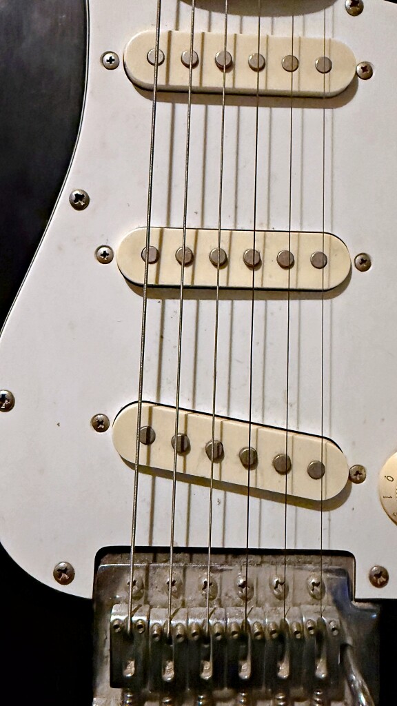 Finally, the pickups and volume and tone knobs. I can see the E string is slightly off center over the pickup, which explains the less than robust sound from it. Will get new strings, clean up the guitar a bit better, and do some research before trying to adjust it. For my first real electric guitar, it seems a fair value and a decent instrument for the level of use it will get. And it will sound ok for me to jam to “Joe’s Garage.”