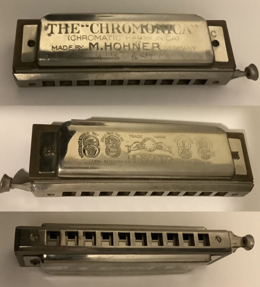 That looks like a standard 10 hole chromatic to me, presumably made for the US market. From the appearance it probably dates from the 1970s or 80s, but as they don’t have serial numbers it’s hard to say with any degree of accuracy. The slide button has taken a knock and will need straightening out if you want to play it.